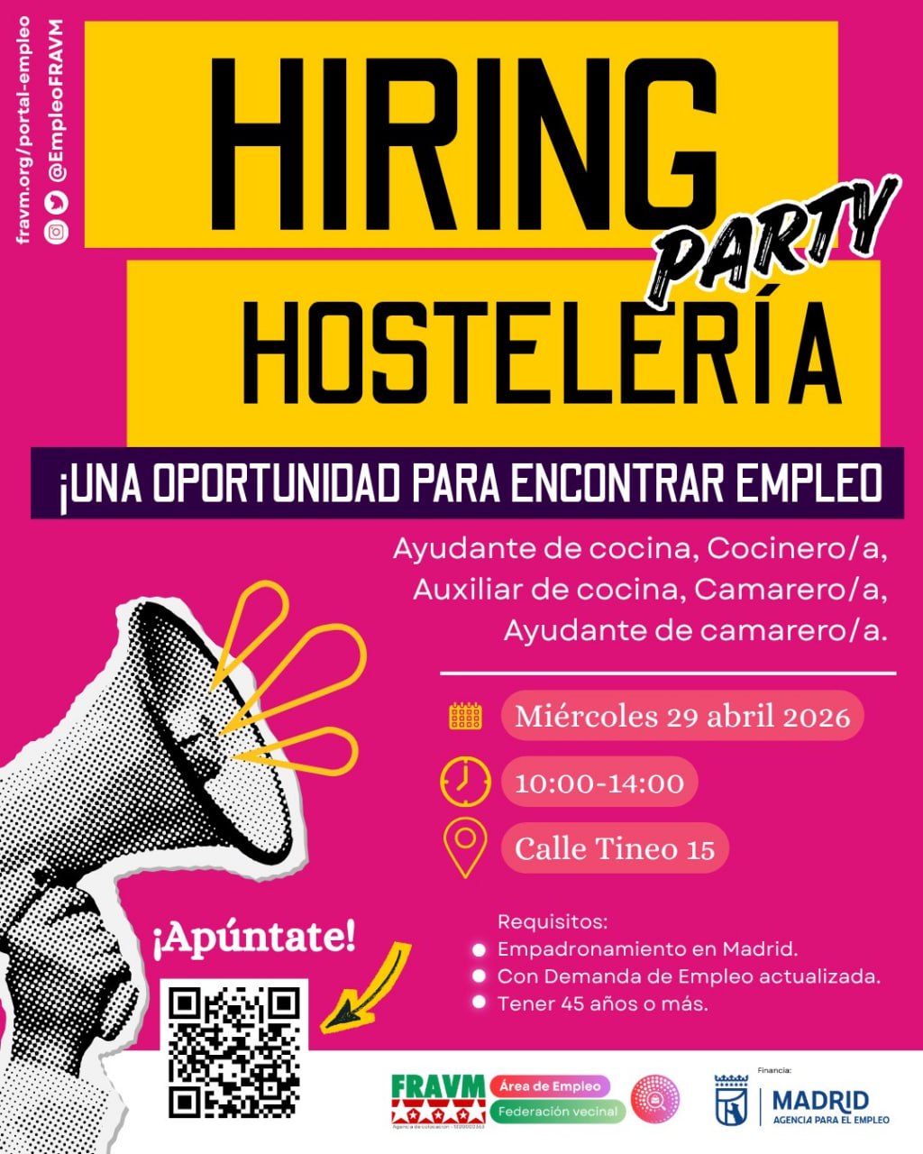 Desde el Área de Empleo de la FRAVM, en el marco del programa Impulso +45 y con la financiación de la Agencia para el Empleo del Ayuntamiento de Madrid, os invitamos a participar en un encuentro ágil donde conectamos directamente a personas en búsqueda activa de empleo con empresas que necesitan cubrir puestos reales.