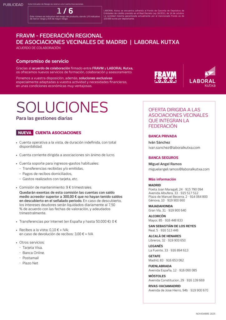 Aquí puedes ver las condiciones generales de la “Cuenta Asociaciones” y la dirección y contacto de las sucursales de Laboral Kutxa en la Comunidad de Madrid.
