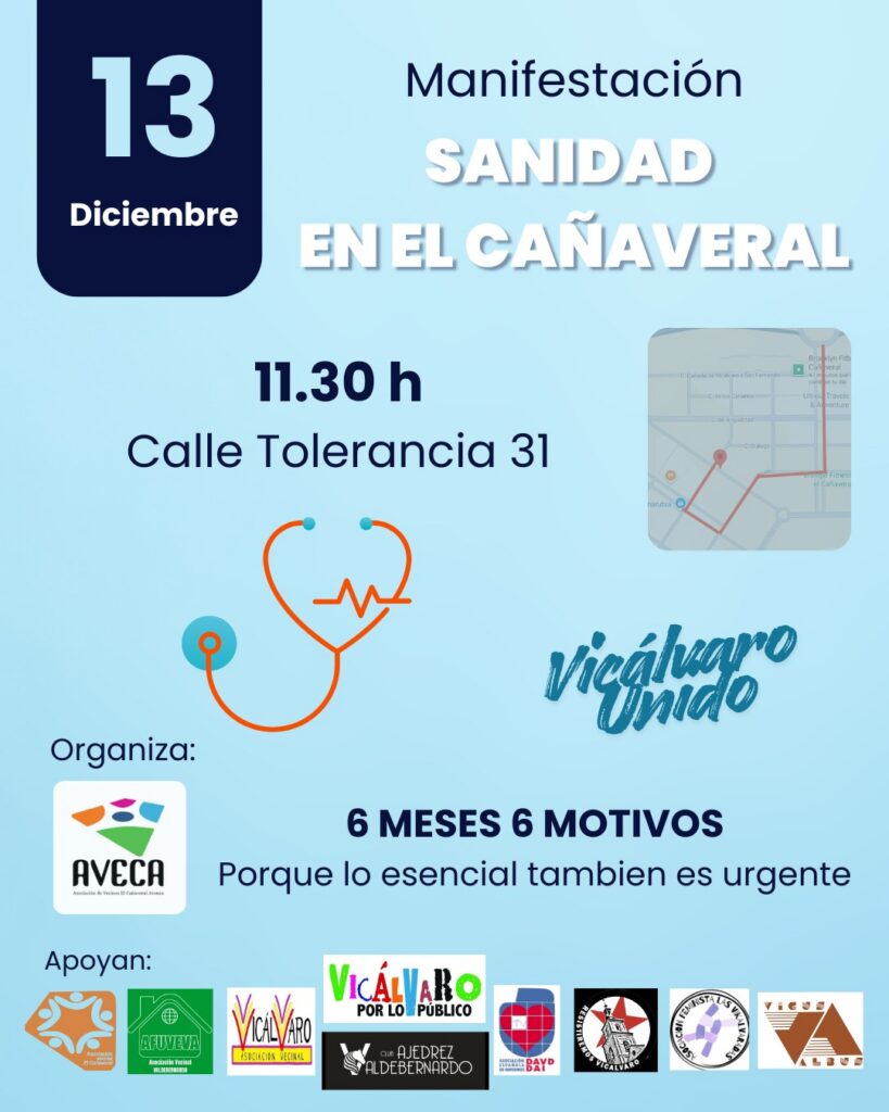 Tercera protesta impulsada por la Asociación Vecinal El Cañaveral Avanza (AVECA) dentro de su campaña “Seis meses, seis motivos”. Tras la marcha que tuvo lugar el 25 de octubre para reclamar servicios para este barrio de Vicálvaro, y la que se celebró el 2 de noviembre para demandar equipamientos educativos, este mes le toca el turno a la sanidad pública. La entidad ha convocado una manifestación para mañana sábado 13 de diciembre que a las 11:30 se iniciará en la calle Tolerancia, 31, ante la parcela reservada por la Comunidad de Madrid para construir el centro de salud que el barrio reclama desde hace años. Como la anterior, la protesta cuenta con el apoyo de la Asociación Vecinal El Cañaveral, la Plataforma Vicálvaro por lo Público, Vicus Albus, Resistiremos Vicálvaro, Asociación DAVD-DAI, la Asociación Vecinal de Vicálvaro, el Club Ajedrez Valdebernardo, la Asociación Vecinal de Valdebernardo AFUVEVA y la Asociación Feminista las Vikalvaradas.