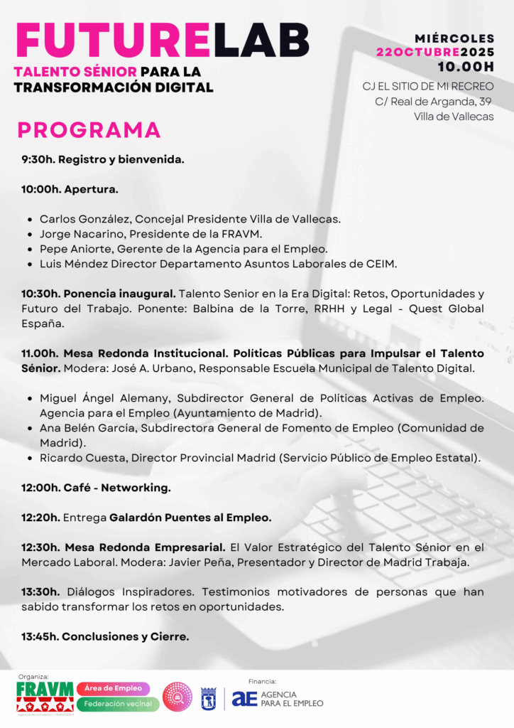 La Federación Regional de Asociaciones Vecinales de Madrid (FRAVM), a través de su Área de Empleo, organiza el próximo 22 de octubre de 2025 en el “CJ El sitio de mi recreo” (C/ Real de Arganda, 39, Villa de Vallecas, Madrid) la segunda edición de FutureLab, una jornada que busca visibilizar y potenciar el papel de las personas mayores de 45 años en la nueva economía digital. El encuentro se enmarca en el proyecto Impulso +45 de la FRAVM, financiado por la Agencia para el Empleo del Ayuntamiento de Madrid.
