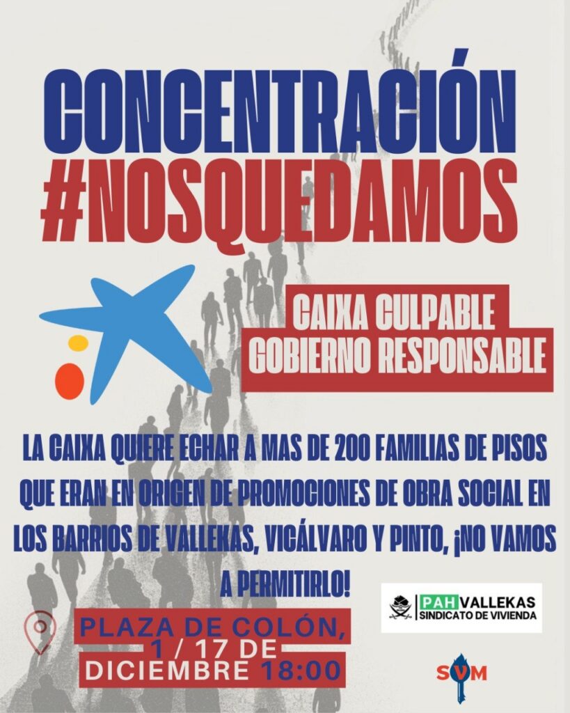 “Tras haberse beneficiado de subvenciones públicas y desgravaciones fiscales para desarrollar su obra social, CaixaBank persiste en aumentar sus beneficios mediante la especulación con estas viviendas. Mientras proyecta una imagen de compromiso social a través de su fundación —centrada en la lucha contra la pobreza o la protección de la infancia—, amenaza con el desahucio a cientos de familias, muchas de ellas con menores, personas mayores y con escasos recursos”, denuncia la PAH Vallecas y el Sindicato de Vivienda.