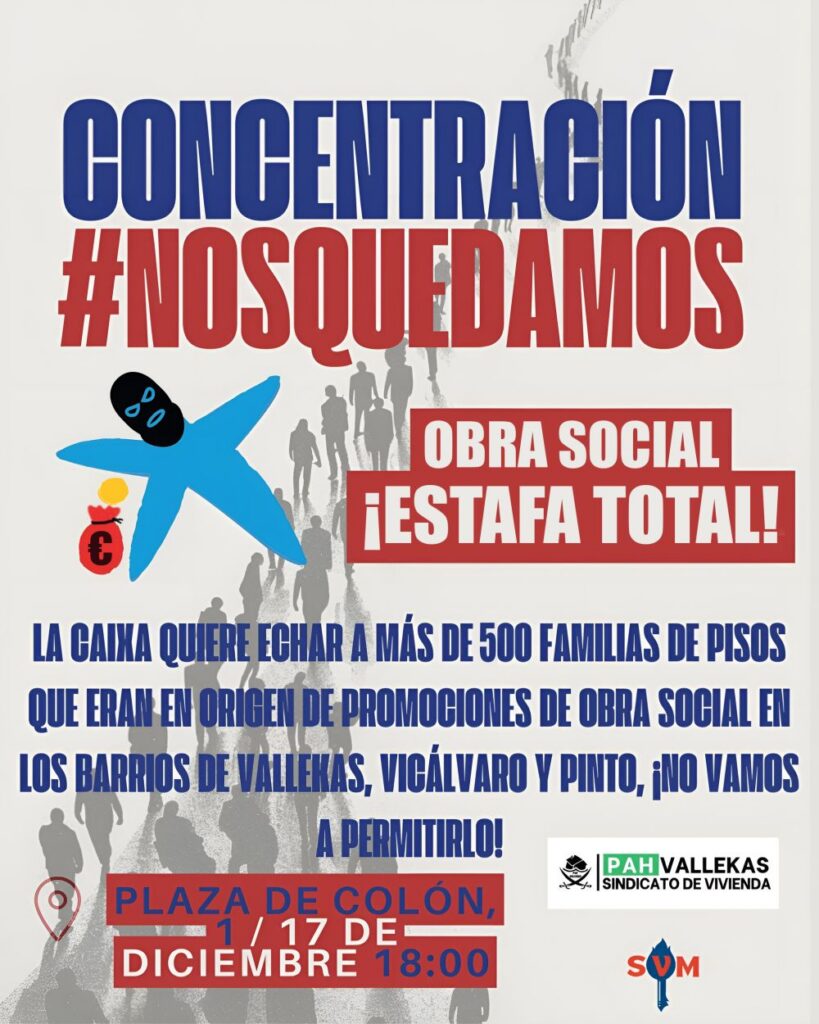 “Tras haberse beneficiado de subvenciones públicas y desgravaciones fiscales para desarrollar su obra social, CaixaBank persiste en aumentar sus beneficios mediante la especulación con estas viviendas. Mientras proyecta una imagen de compromiso social a través de su fundación —centrada en la lucha contra la pobreza o la protección de la infancia—, amenaza con el desahucio a cientos de familias, muchas de ellas con menores, personas mayores y con escasos recursos”, denuncia la PAH Vallecas y el Sindicato de Vivienda.