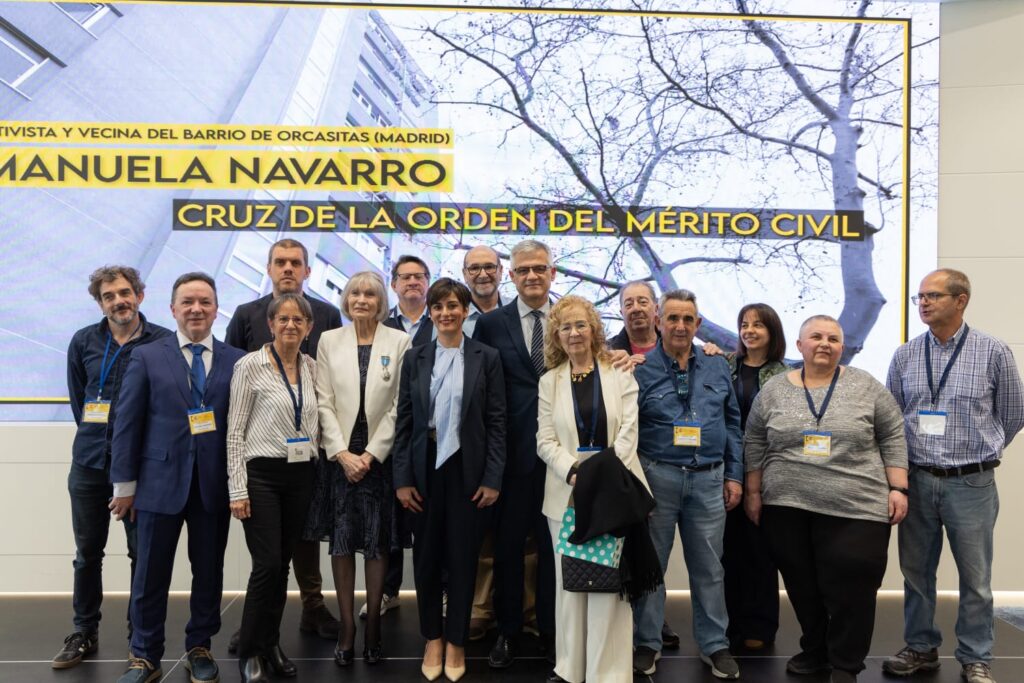 En el movimiento vecinal madrileño estamos de fiesta. El Gobierno central, a través de su ministra de Vivienda y Agenda Urbana, Isabel Rodríguez, entregó ayer a la que fuera responsable de Rehabilitación de la FRAVM y presidenta de la Asociación Vecinal Guetaria del Poblado Dirigido de Orcasitas, Manuela Navarro, la Cruz de la Orden del Mérito Civil por su compromiso vital e implicación en la rehabilitación y modernización de su barrio. Lo ha hecho en una ceremonia en el Ministerio en la que estuvieron presentes parte de su familia, el presidente de la Federación Vecinal, Jorge Nacarino, el que fuera durante años responsable de Urbanismo y Vivienda de la federación, Vicente Pérez Quintana, así como una representación de vecinos y vecinas de Orcasitas (Usera) y activistas vecinales de otros barrios como San Pascual (Ciudad Lineal) en los que Navarro ha prestado apoyo y asesoría en cuestiones de rehabilitación y eficiencia energética.