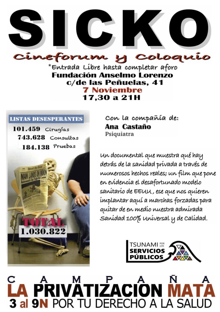 – Viernes 7N. Cineforum y coloquio sobre “SICKO”, de Michael Moore. Fundación Anselmo Lorenzo. C/ de las Peñuelas, 41. 17:30 a 21:00.