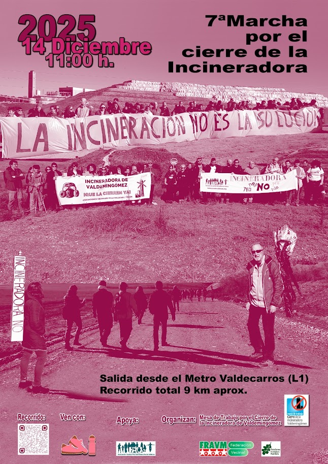En estos cinco años los grupos vecinales y ecologistas han visto cómo se confirmaban sus peores temores y salían a la luz numerosas irregularidades en el funcionamiento de la vieja incineradoras. A veces, las irregularidades han venido de las empresas que la gestionan; otras, del propio Ayuntamiento de Madrid, pero siempre con el beneplácito de la Comunidad de Madrid. La más reciente, conocida estos días, plantea alargar la vida de la planta hasta 2040 para que la empresa concesionaria pueda recuperar sus inversiones. Ante esta perspectiva, la FRAVM, con la Mesa por el Cierre de Incineradora de Valdemingómez, impulsa el domingo 14 la VII marcha hasta la incineradora. 9 kms de caminata de ida y vuelta desde Valdecarros hasta la misma puerta de Las Lomas, donde exigirá las siguientes demandas: