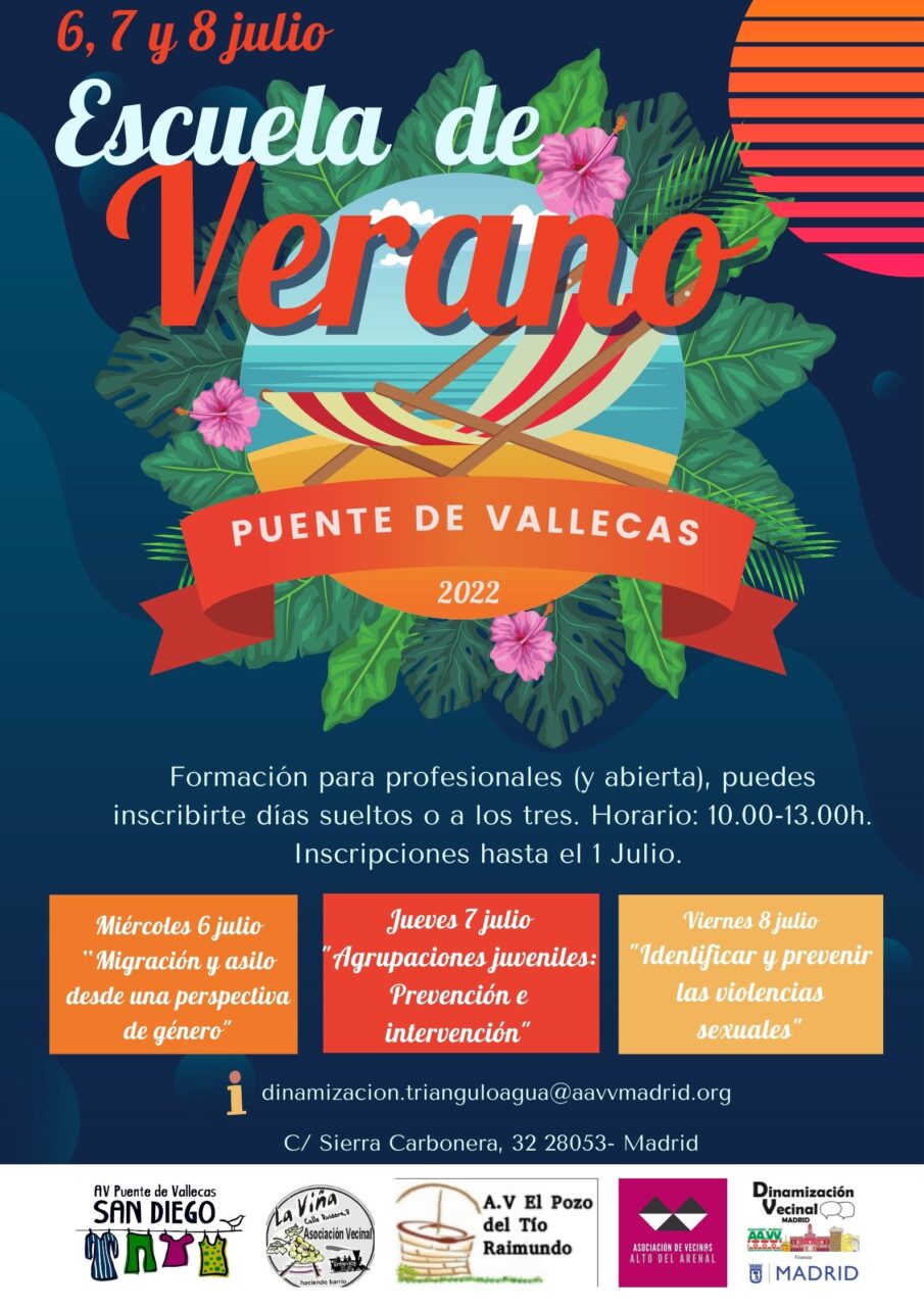 Se ha echado de menos por la pandemia pero por fin este año sí tendrá lugar la formación impulsada por el Proyecto de Dinamización Vecinal en Puente de Vallecas. La III Edición de la Escuela de Verano tratará el 6 julio: “Migración y asilo desde una perspectiva de género”, el 7 dejulio “Bandas Juveniles: Prevención e intervención”, y el 8 de julio “Identificar y prevenir las violencias sexuales”.